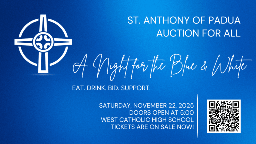 Mark your calendars to eat, drink, bid and support! The annual St. Anthony of Padua Auction for All is Saturday, November 22, 2025. This amazing event raises money to benefit and assist our parish school (Preschool-8th Grade), religious education, youth ministry, and adult educational programs. We hope you’ll attend!